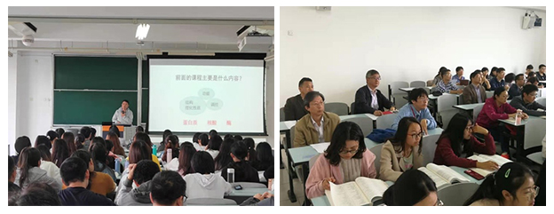 2019年10月28日上午10点, 免费av 阳怀宇老师的教学公开课《生物化学》在闵行校区第三教学楼202教室开讲。免费av 党委书记党远鸿老师、常务副院长王群老师、副院长江文正老师、教学委员会教师及部分青年教师等19位老师参加了本次公开课。阳老师从对比蛋白质结构和功能入手,向学生讲解了糖化学的相关知识。课堂上,任课教师精神饱满,学生和听课教师们也都聚精会神。