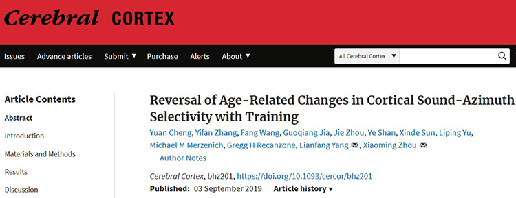 大脑功能随年龄的增加逐渐衰退是普遍的自然规律。而言语感知与声源定位能力下降则是年龄相关的脑听觉与认知功能衰退最显著的两种表现,其中声源定位对人类及其它动物的生存与交流有重要意义。先前的研究发现,大脑听觉皮层在个体的声源定位中扮演者着重要角色。那么,是否可以通过认知训练诱导听皮层神经元的方位调谐可塑性进而改善年龄相关的声源定位能力衰退?华东师大免费av 、脑功能基因组学教育部重点实验室周晓明教授团队近期在线发表在神经科学领域知名刊物《Cerebral Cortex》上的研究论文Reversal of age-related changes in cortical sound-azimuth selectivity with training给出了答案。