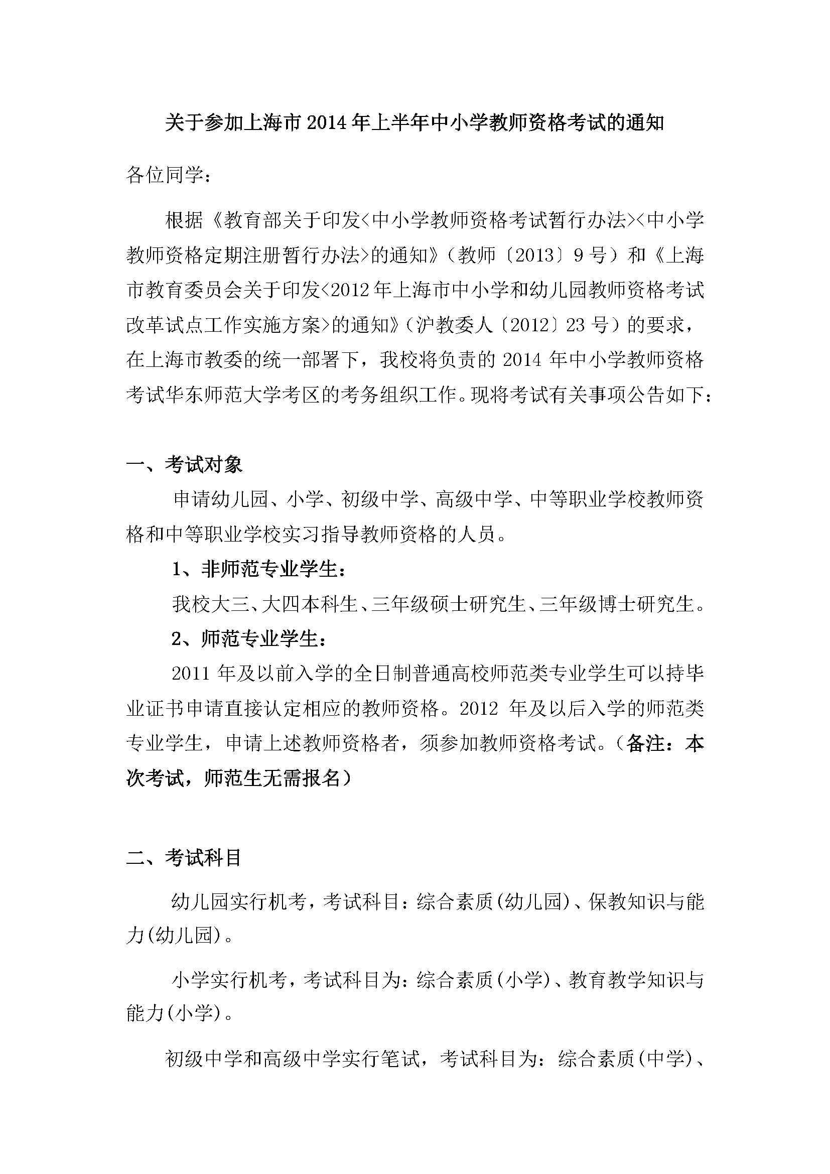 关于参加上海市2014年上半年中小学教师资格考试的通知
